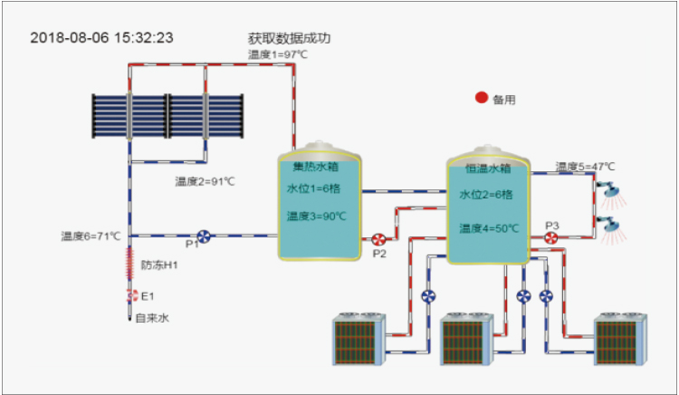 在線監測:實時云圖窗口中為系統的運行示意圖,圖中可以看到系統的動態運行情況,包括各處的溫度值、水箱水位、水泵、電磁閥等設備是否開啟等。可以看到水流動、水泵的轉動等動畫。
