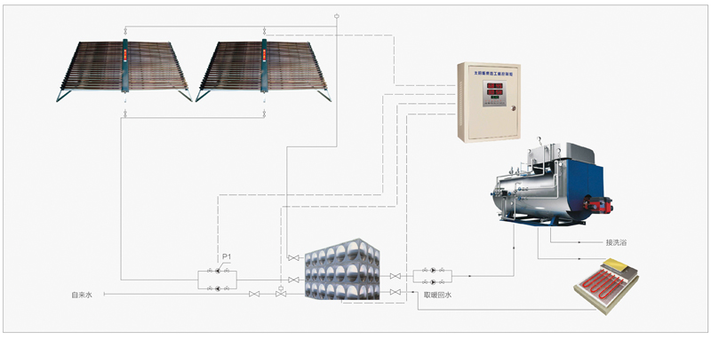 太陽能+鍋爐供熱系統,解決熱水及供暖難題,熱源輸出穩定,制熱效果良好,降低了常規能源用量,減少系統運行費用,降低排放,投資回報率高,1.5年能收回初投資。